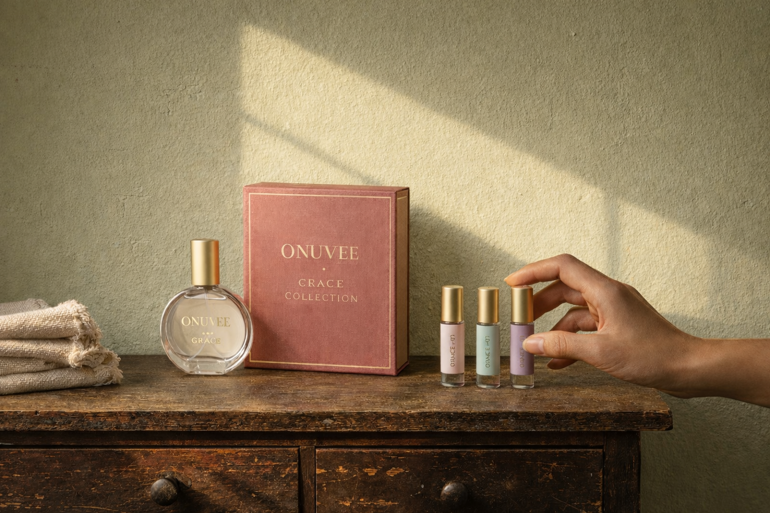 Each Onuvee collection pairs one Eau de Parfum with three perfume oil modifiers. Layer them to shift the scent with your mood — deeper, brighter, or more grounded.